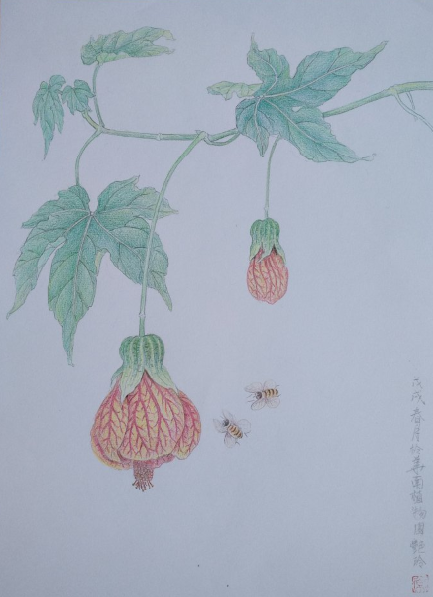 认真地观察了金铃花,我们开始把她细细地描绘下来。常言道,万事开头难,一朵小小的花,还真把我给难住了——是先画叶子还是先画花呢?叶子怎么画?是先从外边轮廓开始还是从叶脉开始呢?好多问题,有数十年绘画经验的常老师给我们一一解答,从线描的空间布局、确定主题、突出特点到粗勾轮廓、层层上色……不知不觉一个上午过去了——原来我也能这么专注、这么耐心地做一件事!以前老是给批评坐不住——哼哼,我终于找到培养注意力的方法了,以后你们再也不能指责我只有三分钟热度了!