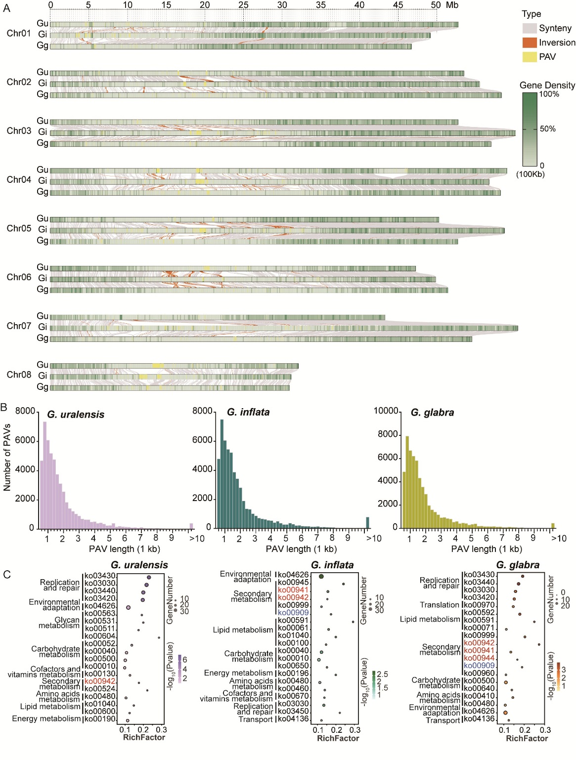 中国科学院华南植物园王瑛团队联合海南大学夏志强团队构建了三种药用甘草乌拉尔甘草、胀果甘草和光果甘草高质量的参考基因组,基因组大小分别为425Mb、447Mb和423Mb。通过全基因组比对分析,发现三者存在共线性关系和结构变异,其中存在/缺失变异(PAV)基因主要富集在次生代谢途径,为解析三种甘草中的共有和差异活性成分的合成和调控提供了基因资源。