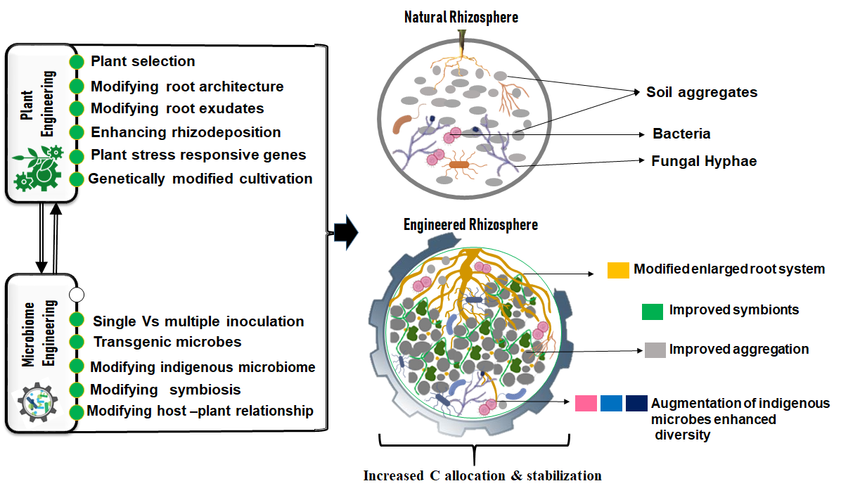 传统的单一农业种植模式依赖大量化肥和杀虫剂的投入导致土壤质量和微生物多样性降低,最终损害长期可持续发展。相比之下,根际工程通过整合植物遗传学、微生物群落调控和核酸技术创新(包括基因编辑与合成生物学)来重构植物-微生物-土壤相互作用,提供了一种变革性的解决方案。该方案有助于养分获取、碳固存、病原体抑制和污染物去除。