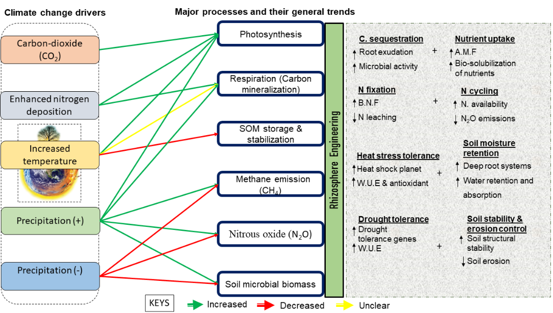 图2. 气候变化对农业生态系统关键生物地球化学过程的影响,以及根际工程在缓解土壤-植物-环境系统冲击中的作用机制