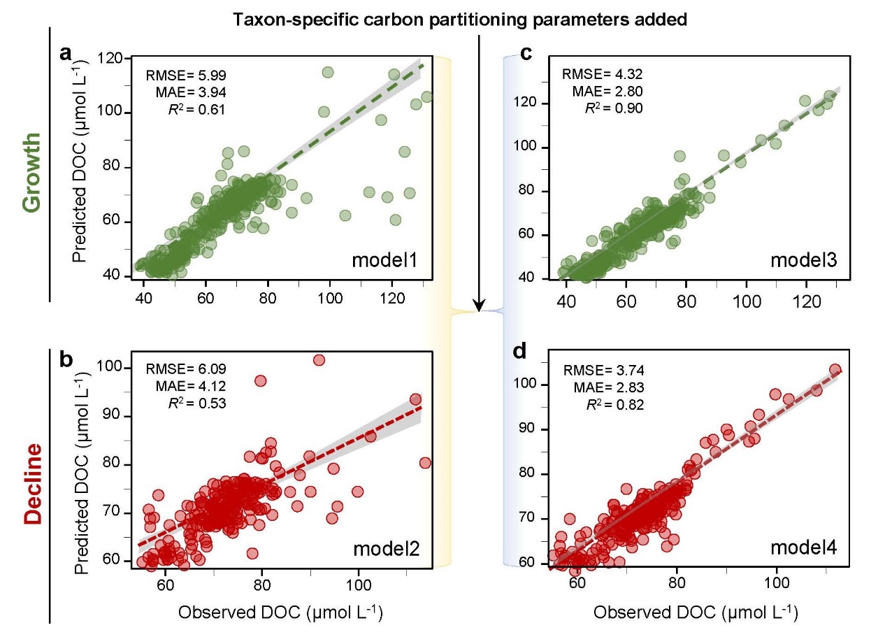 首先,他们利用超高分辨率质谱技术(FT-ICR MS),系统地量化了六个典型藻门(蓝藻门、绿藻门、硅藻门、金藻门、甲藻门和定鞭藻门)类群在生长期与衰亡期下,不同碳馏分(胞内DOC,胞外结合态DOC及胞外溶解态DOC)中BDOC及RDOC的相对占比(图1a和b)。结果发现,在所有的实验藻株中,定义为难以被分解的RDOC都占其总有机碳的10%以上(图2)。这一结果突破了传统对藻源碳多以活性碳为主的认知,也强化了藻类可直接释放RDOC这一现象的普适性。紧接着,在获得这些类群特异的碳分配参数后,本研究进一步结合卫星反演的类群分辨叶绿素浓度数据,构建了机器学习模型,用于预测海洋表层DOC浓度(图1c)。结果显示,引入类群特异的碳分配参数后,模型的预测精度显著提高(生长期和衰退期的R2分别达0.92和0.80,图3a和b),远超未考虑此类信息的模型(R2仅为0.69和0.46,图3c和d)。最后,基于这一优化模型,本研究生成了全球尺度的海洋DOC数据集(图1d),不仅发现海洋表层DOC库的物种贡献度,其中硅藻门对该DOC库的变化贡献最大,解释了高达63.8%的变异;更揭示了不同生长季下藻源DOC的差异性,生长期产生的顽固型DOC显著高于衰退期。这些现象意味着未来浮游植物暴发持续时间及气候驱动的群落结构变化,将深刻影响着海洋DOC动态与碳循环过程。