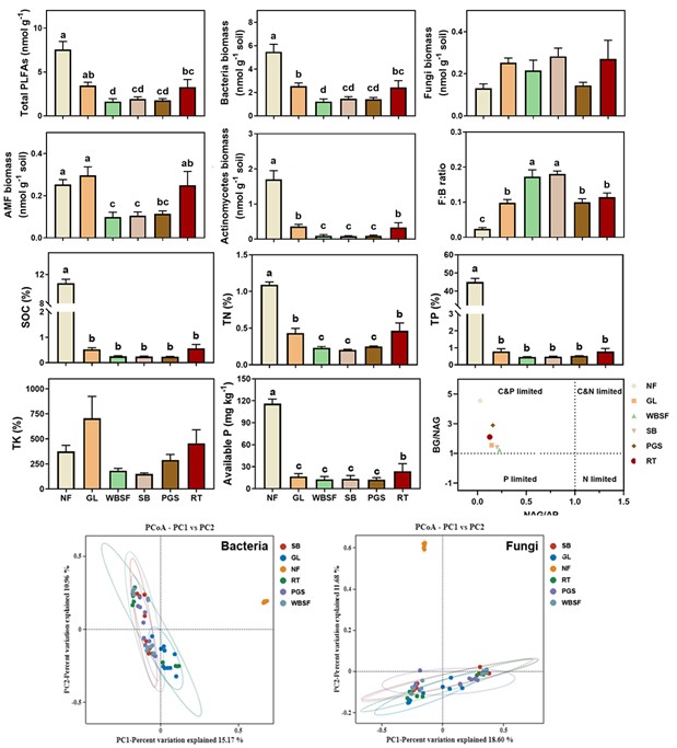 图1. 热带珊瑚岛不同类型人工植被土壤微生物生物量、土壤理化性质(平均值 ± 标准误)、养分限制情况和微生物群落结构(PCoA)与原生植被较。NF:原始林;GL:草坪;WBSF:防风固沙林;SB:防风林;PGS:公共绿地;RT:行道树。不同小写字母代表不同植被类型间差异显著。