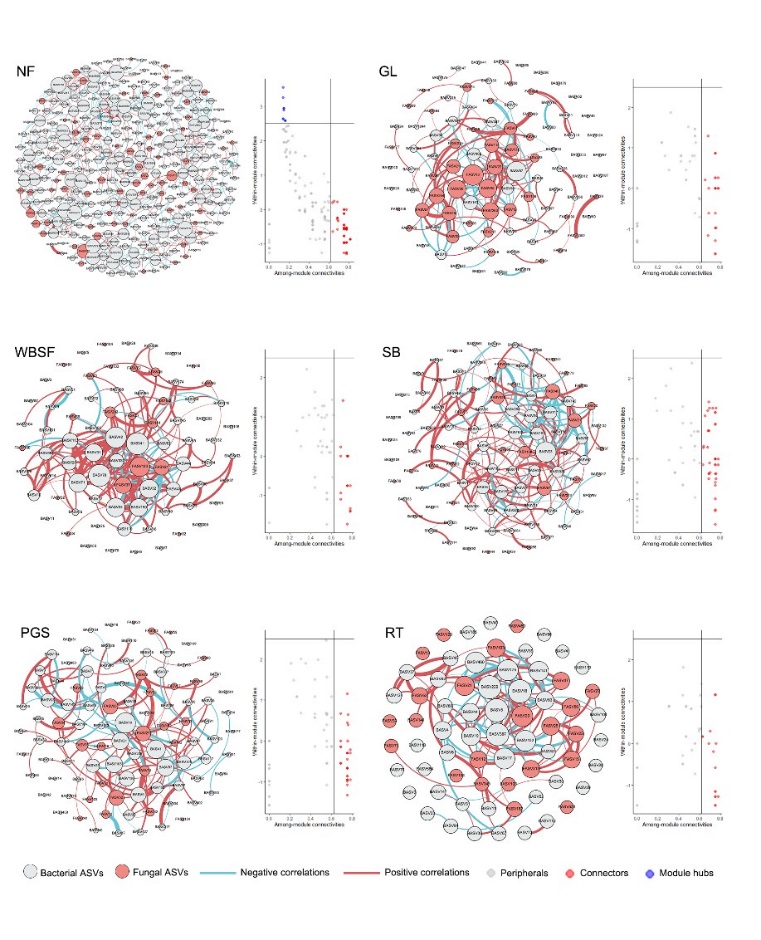 图2. 热带珊瑚岛不同类型人工植被土壤微生物共现网络与原始林的比较。NF:原始林;GL:草坪;WBSF:防风固沙林;SB:防风林;PGS:公共绿地;RT:行道树。