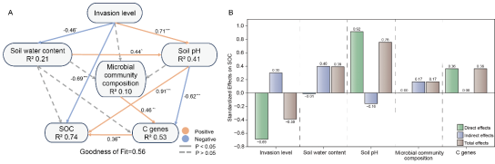 (二)毛竹入侵显著降低了土壤细菌群落多样性与网络复杂性,抑制了与碳循环相关的关键功能基因,导致土壤有机碳含量显著降低。通过Meta分析进一步验证了毛竹入侵普遍导致土壤有机碳含量降低的趋势。表明毛竹入侵通过改变土壤理化性质削弱微生物碳循环潜力,从而影响森林碳汇功能。该研究成果以“Soil Organic Carbon Decline under Bamboo Invasion: The Role of Microbial Carbon Cycling”为题发表于国际学术期刊 Journal of Environmental Management(IF5-year :8.6)上,中国科学院华南植物园鼎湖山站硕士研究生孟楚舒为论文第一作者,周曙仡聃副研究员为通讯作者,刘菊秀研究员参与指导。该研究得到国家自然科学基金、广东省重点研发计划等项目资助。文章链接:https://doi.org/10.1016/j.jenvman.2025.127999