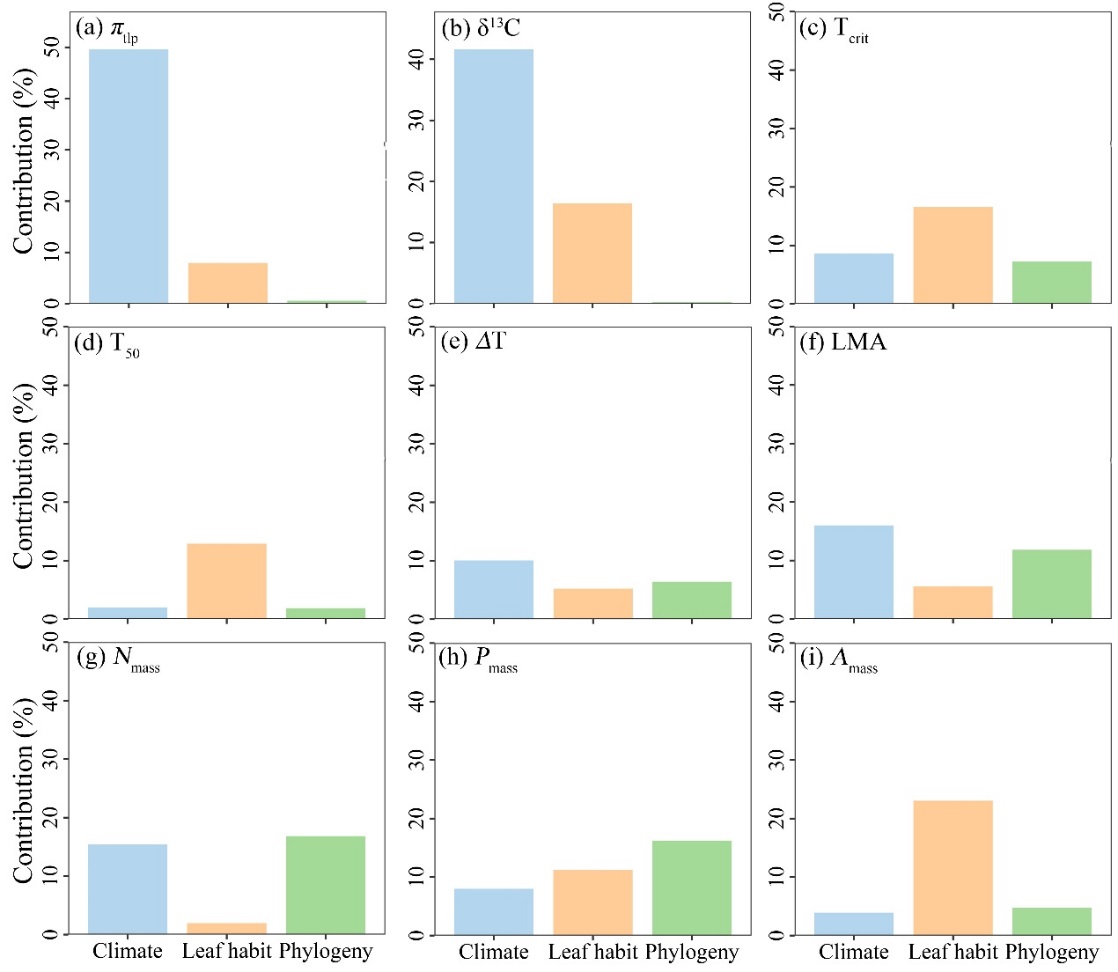 图3. 气候、叶习性和系统发育对叶片耐旱、耐旱和经济性状的影响