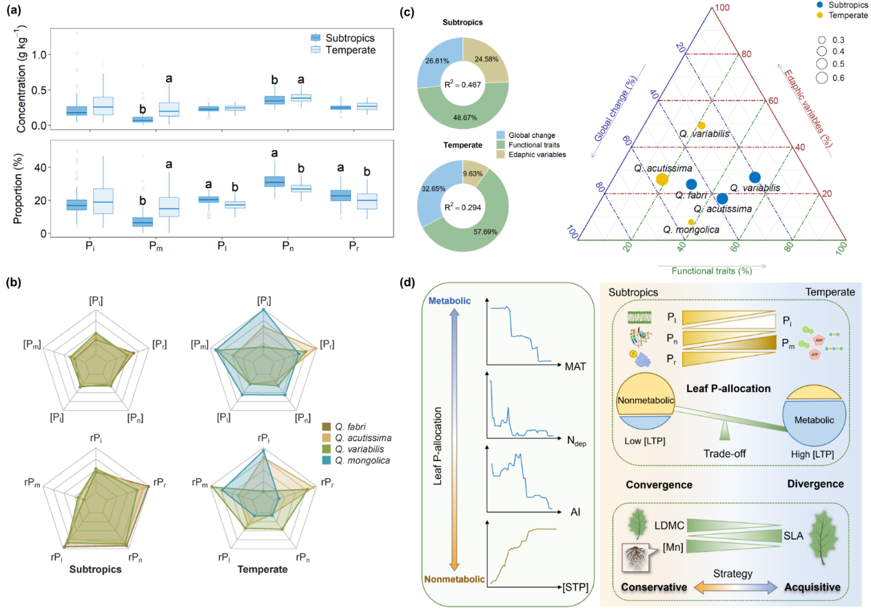 图. 亚热带和温带森林中落叶栎叶片磷分配策略的差异和调控机制