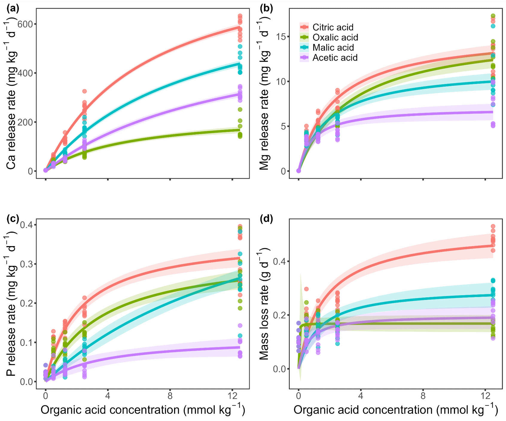 (a)、(b)、(c)和(d)分别表示Ca、Mg、P以及珊瑚砂质量损失的释放速率。在每个子图中,有机酸的关系均通过米氏方程公式进行拟合,即V = Vmax·S / (Km + S),其中V表示释放速率,S表示有机酸浓度(0.5、1.25、2.5和12.5 mmol kg⁻¹,0.0 mmol kg⁻¹表示去离子水)。考虑到初始阶段可能出现“浓度膨胀”,前两天淋出的元素未纳入方程拟合。质量损失速率则计算为每日平均淋溶损失。