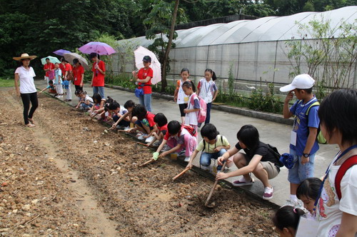 二、在“开心农场”里,园艺专家讲授植物栽培知识并指导小朋友们进行种植实践活动,小朋友们亲自挖坑、松土、浇水、播种、覆土,亲手种下了向日葵、黄瓜和雉鸡尾等植物,亲身体验栽种植物的快乐。