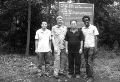 欧洲国际合作者在林区与莫江明(右二)进行学术探讨和交流。