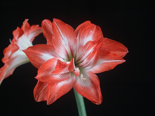 “华锦朱顶红”具5片叶左右的试管苗种植36个月的成熟植株,平均株高20.5厘米、株幅50.5厘米;叶片阔带状、绿色,长36.3厘米、宽4.2厘米;花茎直立、绿色,长50.2厘米、直径2.9厘米,着花4.0朵;花重瓣,红色、基部白色,花朵直径13.5厘米,花筒长9.7厘米。在简易设施栽培条件下自然花期3~4月,单朵花寿命6.5天,单葶花观赏期12.5天。