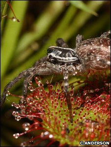 詹宁斯的研究小组在佛罗里达州的湿地进行了实地研究,狼蛛和茅膏菜都把那里当作了自己的栖息地。茅膏菜是一种小型植物,玫瑰形状的叶子一端具有粘性物质,可用于捕获猎物。而狼蛛则是织一种漏斗式的蛛网令猎物上钩。狼蛛和茅膏菜都采用了相同的“被动”系统:依赖粘性物质捕捉猎物(跳虫、苍蝇和蚂蚁这样的节肢动物)的陷阱。