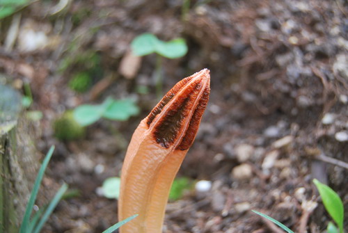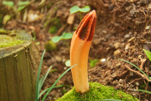 近日,笔者在科普中心院内发现一种特别的物种,颇似沾了墨倒立的笔,只是这笔有6个棱,那“墨”也散发着腐臭,不过“笔”身艳丽,橘黄色,中空,晶莹剔透,异常吸引眼球。