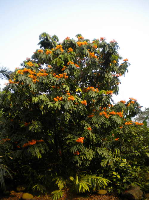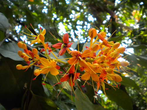 每年的春季,满树满枝的中国无忧花(Saraca dives Pierre)盛开在华南植物园的各个地方,橙黄橙黄的一片片,为游人带来无比祥瑞的色彩。华南植物园的中国无忧花自从1974年从广西大青山引种回来后,生长、繁殖良好,现在遍布在姜园、城市景观园、苏铁园、温室内和园区里的其它地方,十分易于游客观赏。而为游人难以看到是,在植物园的繁育中心种植着的一种在初夏五月盛开的无忧树,它就是垂枝无忧树(Sacara declinata)。乍一看,它和中国无忧花十分相似,要细细观察才能将二者区分。两者的主要区别为: