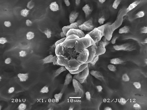 原来,在荷叶的上表面布满非常多微小的乳突,乳突的平均大小约为6-8微米,平均高度约为11-13微米,平均间距约19-21微米。在这些微小乳突之中还分布有一些较大的乳突,平均大小约为53-57微米,它们也是由6-13微米大小的微型突起聚在一起构成。乳突的顶端均呈扁平状且中央略微凹陷。这种乳突结构用肉眼以及普通显微镜是很难察觉的,通常被称作多重纳米和微米级的超微结构。这些大大小小的乳突和突起在荷叶表面上犹如一个挨一个隆起的“小山包”,“小山包”之间的凹陷部分充满空气,这样就在紧贴叶面上形成一层极薄,只有纳米级厚的空气层。水滴最小直径为1-2毫米(1毫米=1000微米),这相比荷叶表面上的乳突要大得多,因此雨水落到叶面上后,隔着一层极薄的空气,只能同叶面上“小山包”的顶端形成几个点的接触,从而不能浸润到荷叶表面上。水滴在自身的表面张力作用下形成球状体,水球在滚动中吸附灰尘,并滚出叶面,从而达到清洁叶面的效果。这种自洁叶面的现象被称作“荷叶效应”。