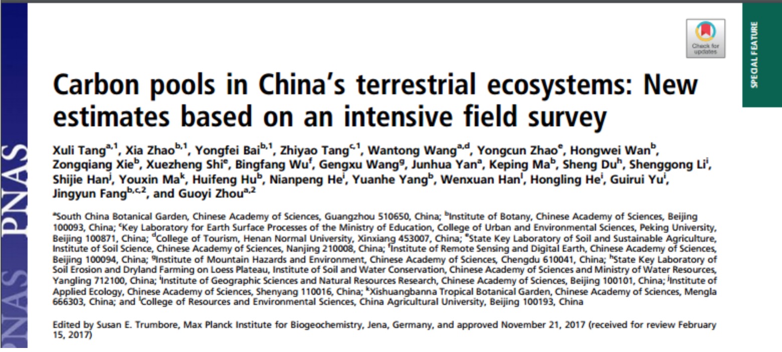 北京时间4月18日凌晨,Proceedings of the National Academy of Sciences of the United States of America (PNAS) 发布了”Climate change, human impacts, and carbon sequestration in China”专辑共7篇论文,集中报道了中国科学院战略性先导科技专项“应对气候变化的碳收支认证及相关问题”(以下简称“碳专项”)生态系统固碳项目群的研究成果。专辑文章摸清了中国陆地生态系统固碳家底,全面、系统地报道了中国陆地生态系统固碳能力的强度和功能特征及其对气候变化、人类活动对响应,量化了中国陆地生态系统固碳能力的强度和空间分布,以及生物多样性和大尺度养分条件对生态系统生产力的影响。我园唐旭利博士、周国逸研究员、王万同博士分别作为第一和共同第一作者发表论文3篇,参与论文1篇。