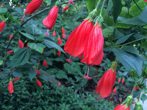 垂花悬铃花(Malvaviscus arboreus var. penduliflorus (DC.) Schery),别名南美朱槿、灯笼扶桑、卷瓣朱槿,锦葵科(Malvaceae)悬铃花属常绿小灌木,外型略似朱槿,但叶片较为狭长浓绿;高30-60cm,叶片互生,卵形或卵状矩圆形,单叶,有时浅裂,叶形变化较多,叶面具星状毛。花红色,花通常单生于上部叶腋处,下垂,花冠呈漏斗形,五枚花瓣略左旋作卷筒状,仅上部略微展开,雌雄蕊细长突出花瓣外,看似永远含苞待放。