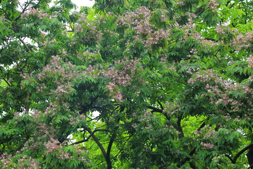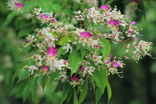 仪花是优美的乡土园林景观树种,具典型的“变色花”特性,花未开时,花托呈嫩绿色,初开时花瓣为白色,盛开时变成紫色,可谓花色多变。花开时节,整个树冠绿色、白色、紫色共存,繁花朵朵,非常美丽。花期4-5月;果期8-9月。
