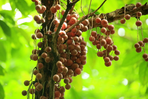 木奶果不仅产量丰富,而且是热带地区典型的老茎生花、老茎结果树种,是植物适应热带雨林生境条件以获得更多昆虫授粉的一种生态策略。每年六、七月间,一串串指头般大小的扁圆形果实挂满了大树,从树干基部连到树顶,甚至坠弯枝条,由生至熟,或绿或黄或红;似绿玉雕成的小球、似乳黄的玛瑙珠子、或似鲜红的珊瑚念珠,煞是招人喜爱。其果肉多汁,酸甜可口,生津止渴,消暑解热。