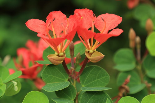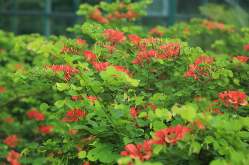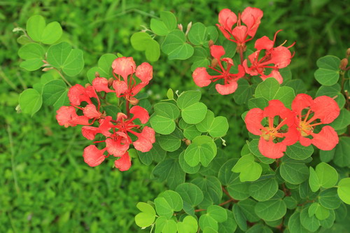 橙花羊蹄甲(Bauhinia galpinii N. E. Br.),为豆科(Fabaceae)羊蹄甲属常绿藤状灌木,又名南非羊蹄甲、嘉氏羊蹄甲。与高大的宫粉羊蹄甲不同,橙花羊蹄甲树形低矮,株高仅50-150cm,枝条细软,枝极平整,向四周匍匐伸展,冠幅常大于高度。叶革质互生,双肾蝴蝶型,形状如羊蹄,故名。花大量,伞房或短总状花序顶生或腋生于枝梢末端,花瓣5瓣,橙红色,热情洋溢,花期5-10月。荚果扁平,初为绿色,成熟时为褐色,且木质化,常宿存。