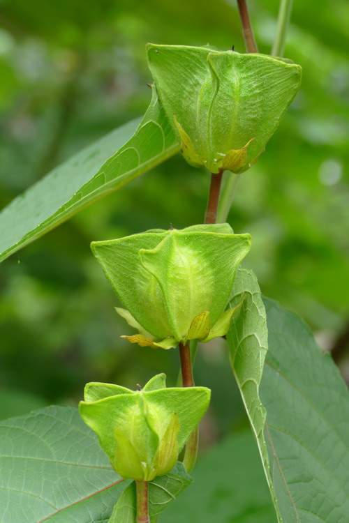 昂天莲是莲么?当然不是,它种在华南植物园生物园,跟朱槿、木槿、木芙蓉共居一室,当然就是锦葵科的货了。昂天莲(Ambroma augustum (L.) L.f.),锦葵科昂天莲属灌木,又名鬼棉花、仰天盅、水麻和假芙蓉。大家都知道,锦葵科的物种大部分开的花都是高昂着头的,这里的“昂天”说的是它的花么?偏不!这里说的是它的果实,昂天莲的蒴果膜质,具五条纵翅,成熟时,舒展开像一朵盛开傲立挺拔的莲花。从侧面看,这果实又像如同一个个杯子,又有人称之仰天盅。它非同寻常,它的拉丁名是Ambroma augusta,其中种加词augusta就是“庄严的,值得注目的”意思。