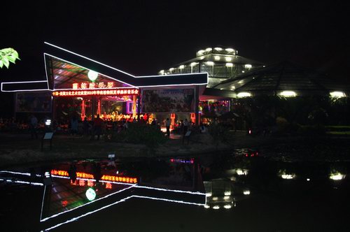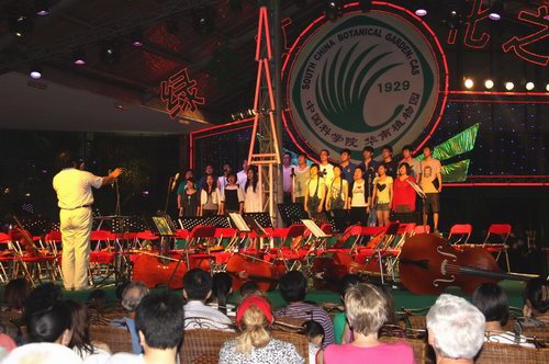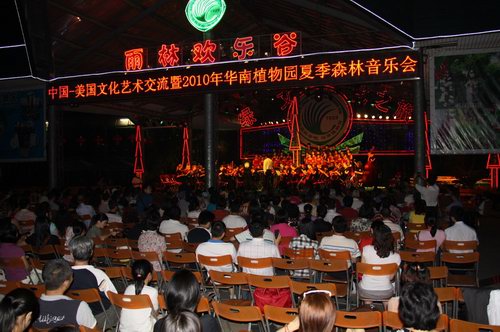 璀璨的夜空下,华南植物园温室群景区华灯绽放,远远望去犹如一颗耀眼的明珠,映衬着夜空格外闪亮。6月5日晚,华南植物园在热带雨林室广场举办了一场别具一格的音乐会——中美文化艺术交流暨2010年华南植物园夏季森林音乐会。音乐会演出阵容强大,来自美国科罗拉多州波德青少年交响乐团、广州爱乐交响乐团、西南交通大学音乐系合唱团、广东文艺职业学院音乐系合唱团等团体的150余位演员参加了演出。