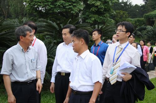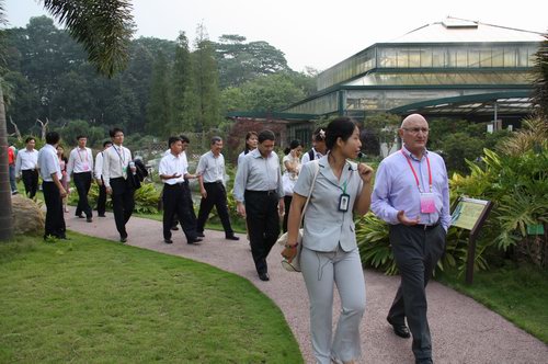 随后,代表团一行在黄宏文、任海等的陪同下参观了园内最具特色的苏铁园、兰园、药用植物园和大型景观温室等。Taleb rifai先生一行对温室群和专类园的建设和构思给予了充分肯定,他认为温室群具有优美的园林外貌、丰富的科学内涵和集世界植物于一体的园艺布局。对于景观温室能艺术地再现亚洲、非洲与美洲热带雨林及亚马逊河谷雨林的神秘与奇特赞叹不已,并对景观设计与植物配置、旅游开放的管理与运作方式等进行了全面了解。