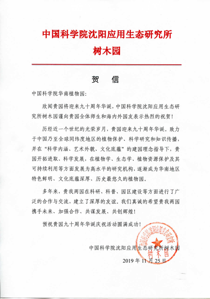 中国科学院沈阳应用生态研究所树木园发来贺信