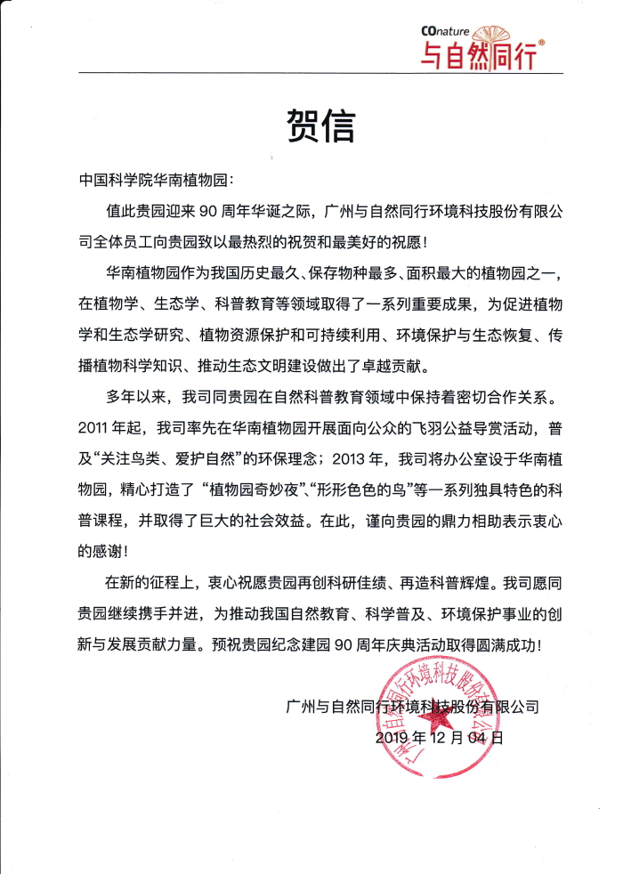 广州与自然同行环境科技股份有限公司发来贺信