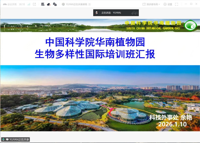 随后,园科技外事处副处长余艳分享了中国在生物多样性国际合作与能力建设方面的丰硕成果。自2009年起,华南植物园连续主办六届国际培训班,融合理论讲授、实验操作、野外考察、实践演练与文化体验于一体,为发展中国家学员赋能。2026年,培训将聚焦全球热点地区生物多样性保护计划,面向“一带一路”及拉丁美地区,致力于培养贯通理论与行动的国际化人才。