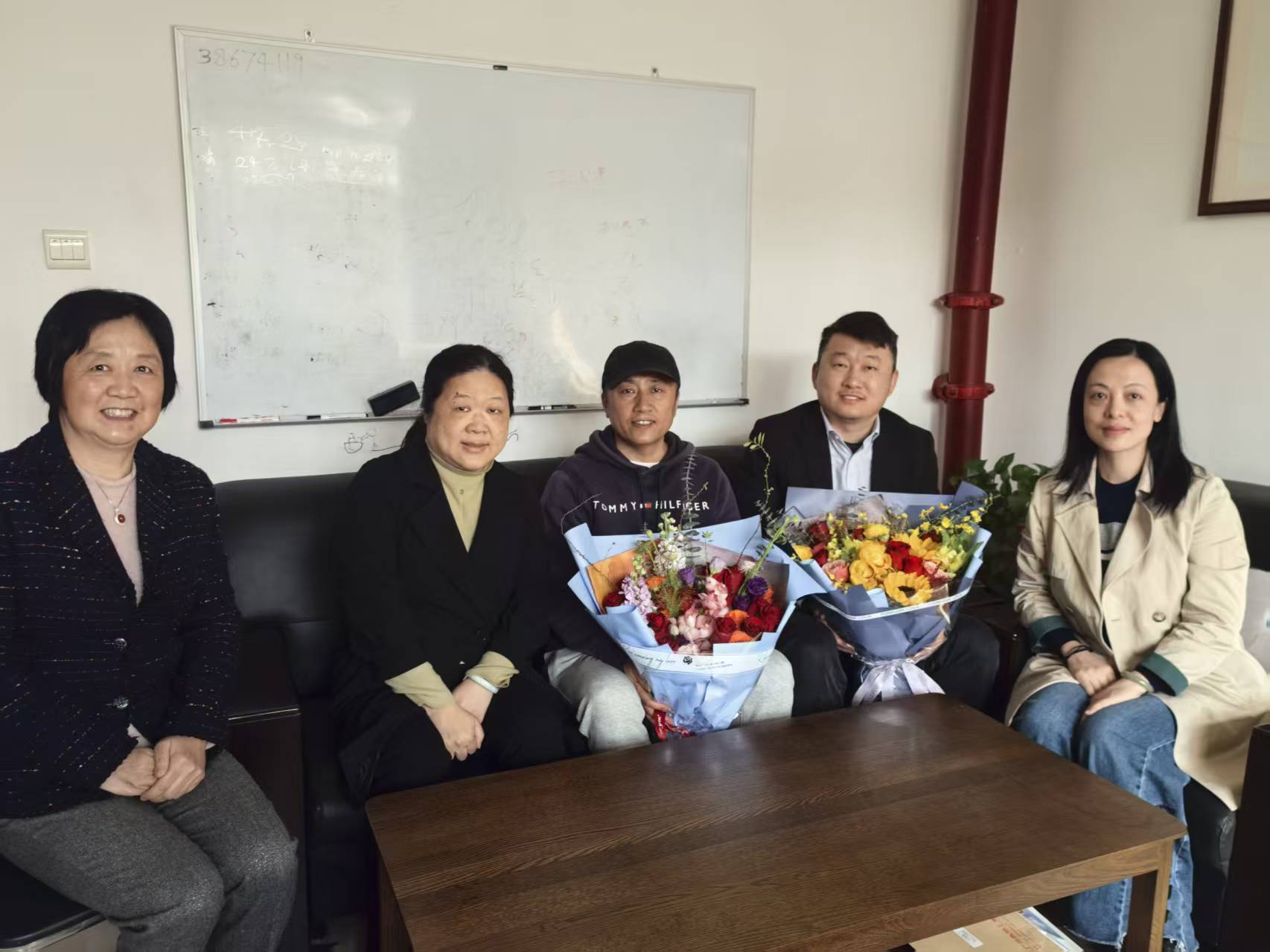 图. 广东省侨联领导看望新侨代表侯兴亮研究员(中)和王法明研究员(右2)