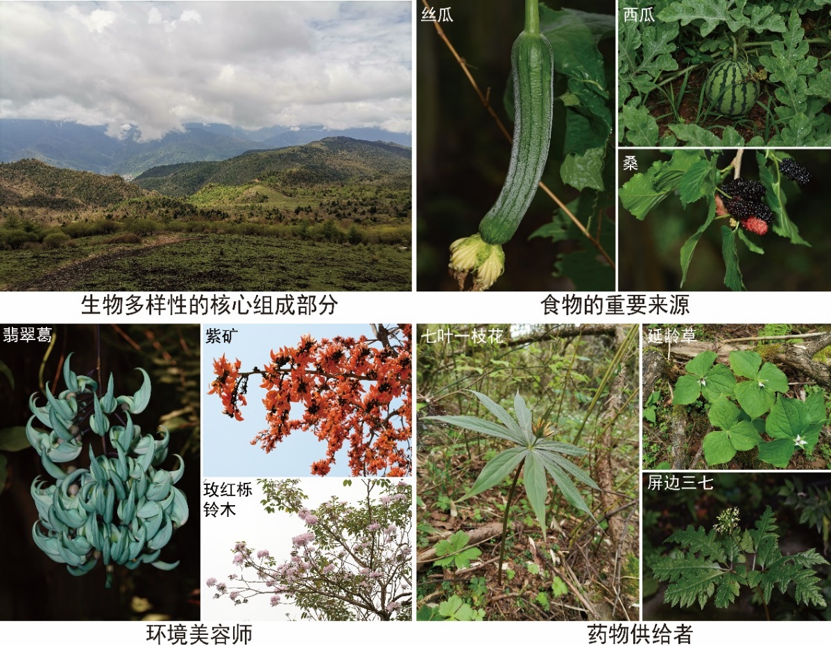 植物资源是全球生物多样性的核心组成部分,是人类社会和经济可持续发展的物质基础(图1)。受生境退化、物种入侵、过度采伐以及气候变化等因素的影响,植物正以高于其自然灭绝速率500倍的速度丧失,全球植物多样性保护形势严峻。我国高度重视生物多样性保护工作。2021年,国家林业和草原局与农业农村部联合颁布了《国家重点保护野生植物名录》,明确了国家重点保护野生植物的范围;2023年,生态环境部与中国科学院联合推出更新版《中国生物多样性红色名录——高等植物卷(2020)》,科学评估了我国高等植物受威胁状况。上述重要文件的出台,不仅提升了我国生物多样性保护工作的规范性和科学性,更为植物保护政策的制定与实施提供了坚实的法律依据和行动指南。珍稀濒危植物是植物多样性保护的核心对象。当前我国珍稀濒危植物主要包括《国家重点保护野生植物名录》收录的所有植物物种和《中国生物多样性红色名录——高等植物卷(2020)》中评估为极危(CR)、濒危(EN)、易危(VU)三个等级的植物物种以及极小种群植物。
