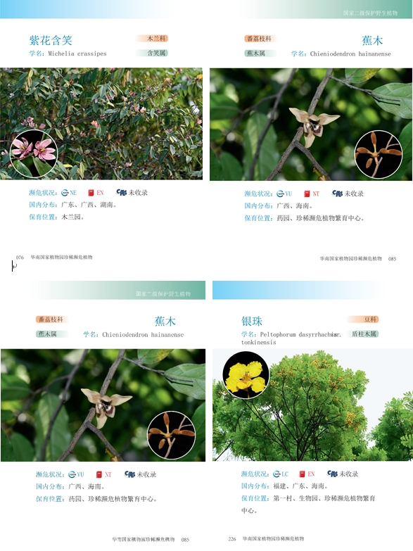 《华南国家植物园珍稀濒危植物》一书精选了华南国家植物园引种保育的300种特色珍稀濒危植物进行展示,并提供了科、属、国家保护等级、IUCN物种受威胁等级、红色名录等级、CITES附录等级以及保育位置等信息。书中所涉及图片多为园区内拍摄,少数展示效果欠佳的物种采用野外照片予以补充呈现。