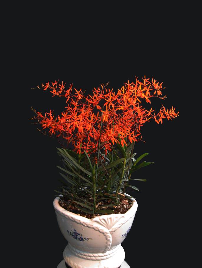 ‘麒麟火焰兰’是目前市场上还很少见的新型兰花品种,株型直立,翠绿硬挺的带形叶片整齐对称地排列于主干两侧,花葶自叶腋伸出,姿态飘逸;其花色橙红,带鲜红色斑点,分枝多,花数可达60朵以上,远观如火焰跃动,近观则精巧可爱;该品种具有较强的耐热性、耐冷性以及抗病性,易栽培,易开花,在广州简易大棚栽培即可正常生长、开花。麒麟火焰兰可作盆花、切花和园林造景,有较好的市场前景。审定编号为:粤审花2009004。