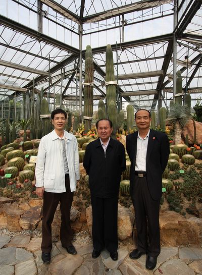 参观沙漠植物室合影,司马义?铁力瓦尔地(中)、任海(左)