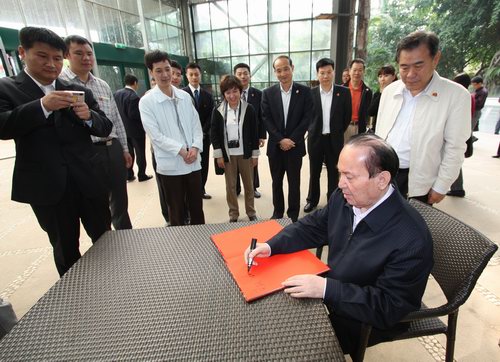 华南植物园党委书记任海对司马义?铁力瓦尔地一行的莅临表示热烈欢迎,并表达了黄宏文主任的问候。随后,司马义?铁力瓦尔地一行兴致勃勃地参观了大型景观温室群,认真察看了热带雨林温室的环境模拟、雨林景观的营造和奇特的植物布局,以及沙漠植物室、高山/极地植物室、奇异植物室及植物水族馆等温室景区,还参观了正在展出中的“帝王花展”,为如此美丽的帝王花在亚运之际全面绽放赞叹不已。司马义?铁力瓦尔地不时提出各种问题,就园艺布局、植物养护等话题与陪同人员进行交流,并和大家多次合影留念。参观结束后,司马义?铁力瓦尔地还用汉语和维吾尔语两种文字在嘉宾簿上签名留念。