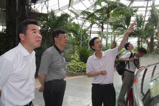 访问期间,任海陪同上海分院代表团重点参观了世界植物奇观—温室群景区。他们兴致勃勃地参观了温室的环境模拟、雨林景观的营造和珍奇植物的园艺布局,对精湛的园林景观以及引种自世界各地的奇异植物和高水平的保育工作表示了赞赏和肯定。