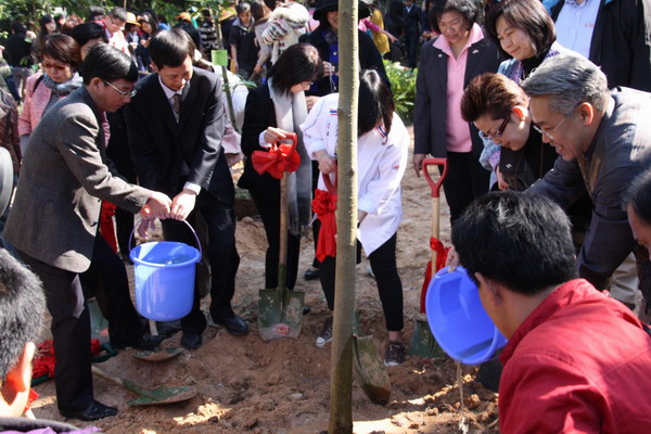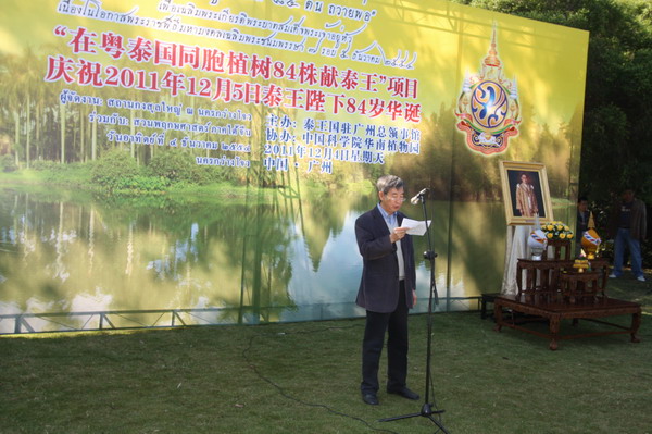 在活动的启动仪式上,泰国驻广州领事馆总领事林培森首先致开幕辞。他说,在12月5日泰国国王陛下84岁华诞来临之际,泰领馆与华南植物园共同举办“泰国在粤同胞植树84株献泰王”的活动,是为颂扬国王在大自然保护方面的卓越贡献。今年泰国发生了60年一遇的罕见水灾,让泰国民众更加意识到对森林保护、关爱环境的重要性,因此开展植树活动也是培养大家对自然和环境的热爱和责任。他衷心感谢华南植物园在此次活动中给予的极大热诚和支持,希望中泰友人共同种下的树木成长成为中泰友谊的标志和见证。