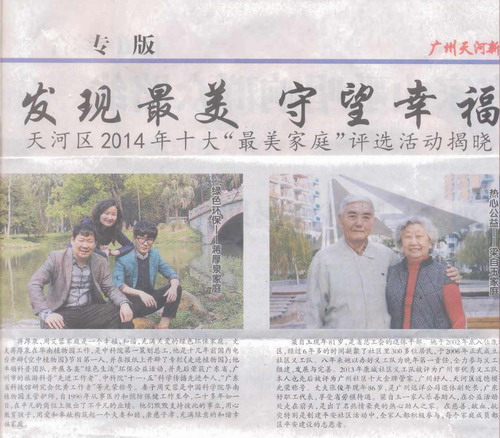 晚会现场,大会宣读了2014广州天河区十大“最美家庭”名单,其中华南植物园职工蒋厚泉、周艾蓉获得了“绿色环保家庭”称号,石奇珠为获奖家庭颁发了荣誉奖牌。评委组对获得十大“最美家庭”的“绿色环保—蒋厚泉、周艾蓉家庭”给予了肯定评价,一个幸福和谐、充满关爱的绿色环保家庭。蒋厚泉十几年来积极从事科普旅游工作,他率领科普团队开展了各类绿色环保科普活动,先后荣获广东省、广州市旅游科普“先进工作者”、中科院“十一五”科学传播先进个人等光荣称号。周艾蓉从事医疗和预防保健工作20多年,她尊老爱幼、勤俭持家,2013年她被广州市评为“廉内助”的光荣称号。