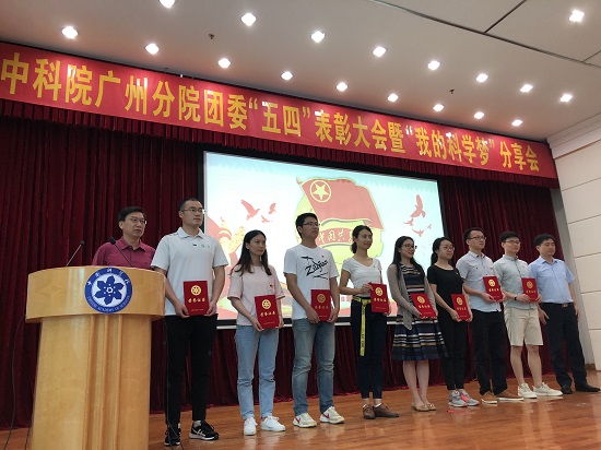 分院党群工作处处长郭震宣读了《中国科学院广州分院团委关于表彰2016-2017年度五四红旗团组织、优秀共青团干部、优秀团员的决定》。陈广浩为受表彰的五四红旗团组织、优秀共青团干部、优秀团员颁奖。华南植物园共青团员赵海婵、张硕、彭琪媛同学获得广州分院优秀团员光荣称号。此外,赵海婵、彭滔同学在征文比赛与演讲比赛中表现突出,获得了大会的表彰。
