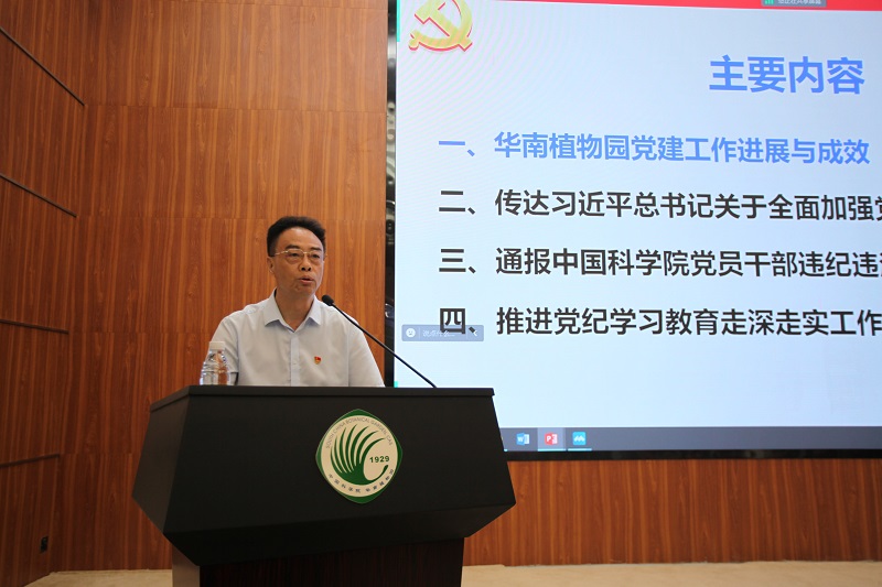 会上,党委书记、副主任魏平作题为《学党纪 守规矩 强党性 勇担当 以良好的作风保证党纪学习教育走深走实》的专题党课报告。报告通报了一年来华南植物园深入学习贯彻党的二十大精神、巩固拓展主题教育成果、扎实开展干部队伍教育整顿、加强基层党组织建设、传承和弘扬科学家精神、促进党建与业务工作融合发展、强化作风学风及创新文化建设等工作进展与成效。传达学习了习近平总书记关于全面加强党的纪律建设的重要论述的科学内涵和实践要求。通报了党员干部违纪违法典型案例,强调以案为鉴、警钟长鸣,让党员干部受警醒、明底线、知敬畏。报告对持续推动党纪学习教育走深走实,提出了四点要求。一是提高政治站位,把纪律建设摆在更加突出的位置。二是抓住根本任务,始终在政治立场、政治方向、政治原则、政治道路上同以习近平同志为核心的党中央保持一致。三是常敲思想警钟,把遵规守纪刻印在心,内化为言行准则,做一名忠诚干净担当的党员领导干部。四是勇于担当作为,要聚焦“忠诚”这个根本点、“干净”这个着力点、“担当”这个落脚点,力戒形式主义,推动中心工作。