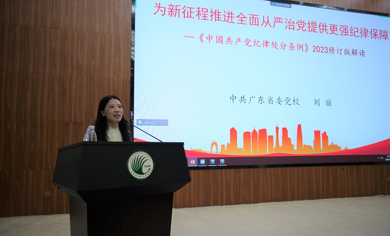 大会邀请广东省委党校刘丽副教授作题为《为新征程推进全面从严治党提供更强纪律保障——<中国共产党纪律处分条例>2023年修订版解读》的专题学习辅导报告。她以宽阔的理论视野和丰富的教学实践,围绕《条例》的修订背景、主要内容和贯彻落实三个方面作深入分析和阐述,结合各类违纪违法典型案例剖析对六项纪律进行了深入解读。