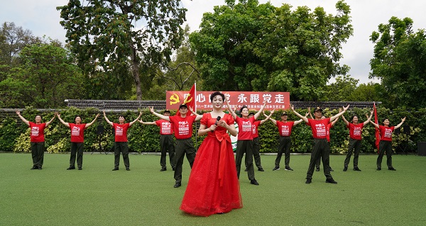 523日上午,为庆祝建党百年华诞,园艺中心党支部与广州八一艺术团在华南植物园游览区温室稀树草坪广场联合举行主题为同心向党、永跟党走的庆祝建党百年文艺汇演,节目表演以八一艺术团为主,园艺中心党支部参与了《没有共产党就没有新中国》《我和我的祖国》的大合唱。尽管适逢周末,但是为了组织好这次活动,园艺中心大部分党员积极参与其中,或参加合唱或作啦啦队员摇旗呐喊。此次活动园艺中心党支部有30多名党员参加,广州八一艺术团有60多人参加,共计100余人。华南植物园党委副书记/纪委书记徐海出席并致辞,园艺中心副主任/党支部书记夏汉平领队参加活动并作发言。