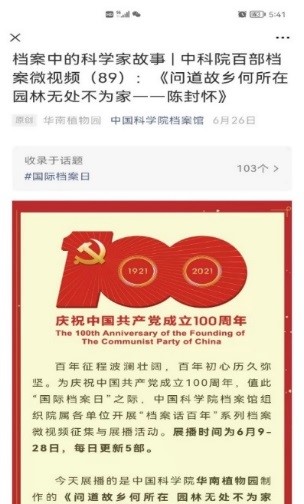 视频播出后备受好评,广为转载传播:在华南植物园、中科院档案馆微信公众号推送;在今年7月1日新落成广州分院、华南植物园“根植华南·家国天下”党员主题教育基地为观众播放;被选为中科院继续教育网专题《弘扬科学家精神》学习资源;12月又光荣地被选录进《学习强国》“科技人物专栏”,对于弘扬科学家精神,传承我园优秀传统文化起到了积极的作用。