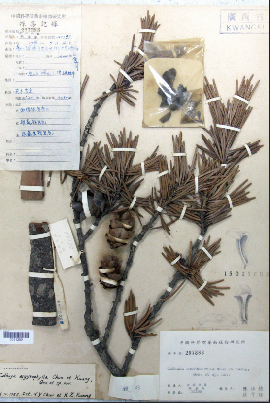 1956年采集于广西,1958年由陈焕镛与匡可任定名发表的银杉模式标本 (图片来源:华南植物园标本馆)