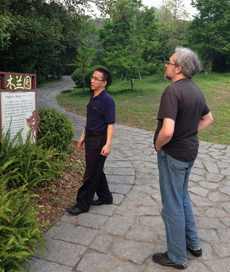 傅声雷研究员(左)陪同Frank Berninger教授考察木兰园