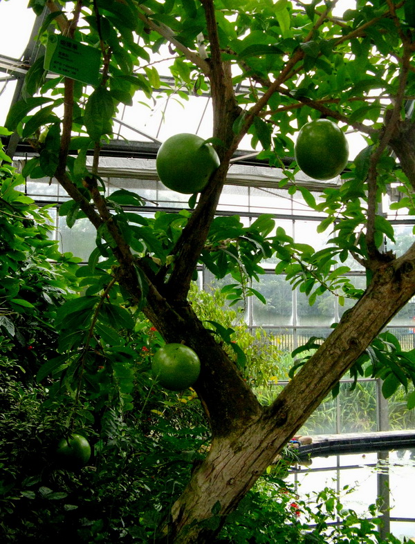 热带雨林温室内,有一棵树挂满了果实,又圆又大的,炮弹“从天而降”之势,引来众多游客驻足观赏。因其形状果实酷似原始的炮弹,被形象地称之为炮弹果。
