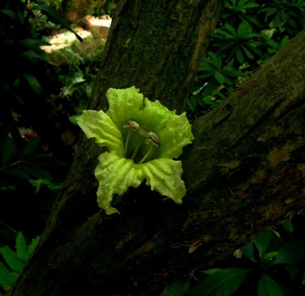 炮弹果(Crescentia cujete L.)为紫葳科葫芦树属常绿小乔木,为典型的热带雨林“老茎生花”植物,花、果单生于小枝或老茎上;花冠钟形,淡绿黄色,具褐色脉纹,有深裂。原产于热带美洲,我国广东、福建、海南、台湾等地有栽培。这株炮弹果于三年前移植到热带雨林温室,首次在室内结果,实属罕见.