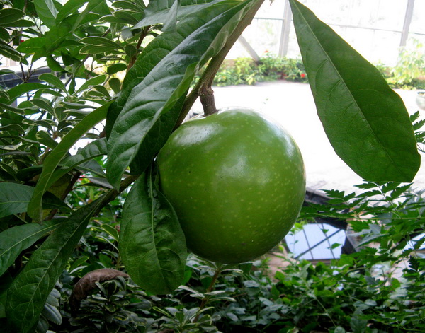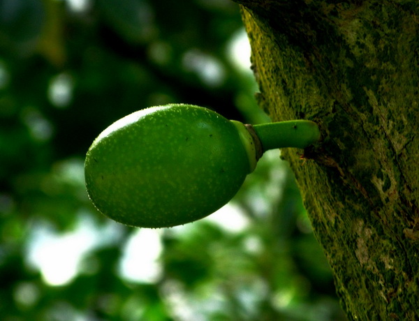 它的名字似乎带着浓烈的火药味,其实炮弹果是著名的热带观果植物,这种奇异的果实生长速度很快,小小的幼果不出几天直径就能达20多厘米。观果期长,果实外观青绿光亮,又像西瓜,又像葫芦,让人误以为是一种美味的热带水果,其实它只是好看而不能食用的,果肉粘稠状,有异味,口感不良。当然炮弹果也不只是被观赏,因为果壳坚硬,常被用来制作容器或是工艺品。