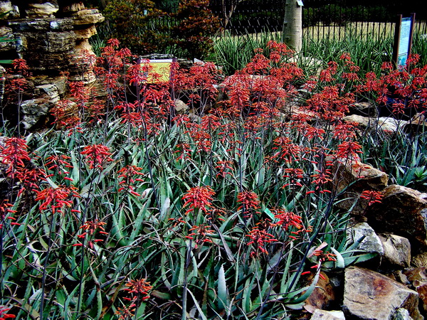 原产非洲热带干旱地区的芦荟在华南地区大都在2-3月份开花。异色芦荟开花性状很整齐,花期一到,齐刷刷地伸出花茎,美丽的红花密密地长在细长的花茎上。成片种植的异色芦荟开花构成一道独特的风景线,放眼望去,红艳艳的一片,灿烂无比,非常醒目,把大地装扮得热闹非凡。单朵小花钟状下垂,尖端开裂,伸出黄色的花芯,像美丽的小喇叭,微风中轻轻摆动,风姿绰约,楚楚动人。