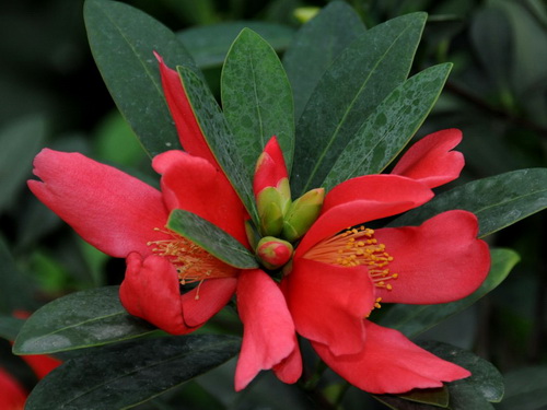 杜鹃红山茶(Camellia azalea )属于山茶科山茶属植物常绿小乔木,其叶片浓绿色,狭长倒卵形,边缘和叶面光滑,厚而有革质;花朵顶生或腋生,花瓣肉质较厚、呈长条状、鲜红色、花药金黄色、单瓣。杜鹃红山茶是一个奇异特殊的山茶原种,比普通的山茶花具有更多的特殊性。首先是叶片,我们一般看到的茶花,叶片边缘大都有明显的锯齿,而杜鹃红山茶的叶片边缘是全缘的,没有锯齿,十分光滑,形状、密度与杜鹃花十分相似,因此便有了“杜鹃红山茶”的名字。其次是花期,通常茶花的开花期从10月到来年4月,花期长达半年,没有在夏天开花的茶花,而杜鹃红山茶的盛花期在6月到11月,即使在炎热的夏季,依然满树红花,十分娇艳,如果栽培得好,一年四季都可以开花,因此也有“四季茶花”的别称。再次是抗逆性强,茶花常常被人们说成是怕冷、怕热、怕病虫害的娇气的花卉。可是杜鹃红山茶是抗逆性较强,它不仅在夏天开花,而且能忍耐-5℃,在长江以北的部分地区能露天栽培。因此杜鹃红山茶是一种很值得鼎力推广的园林绿化树种。